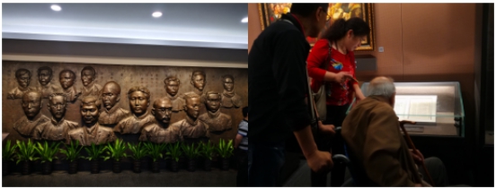 走進"一大"會址,首先映入眼簾的是13位中共代表及2位共產國際代表銅頭像。他們是毛澤東、何叔衡、董必武、陳潭秋、王盡美、鄧恩銘、李達、李漢俊、張國燾、劉仁靜、陳公博、周佛海、包惠僧及荷蘭人馬林和俄羅斯人尼柯爾斯基,左手邊是巨幅黨旗,重溫入黨誓詞,激情澎湃,激蕩回響。忽然,我看見一位老人坐著輪椅被推到成列窗前,旁邊的女子大聲給老人講解并手指相片,可能老人耳朵聽不清,久久凝視,用顫抖的右手撫摸著放照片的成列窗玻璃,張張嘴,笑了。這一場景我的心顫了,我看到老人眼里含著淚笑,而我卻哭了……