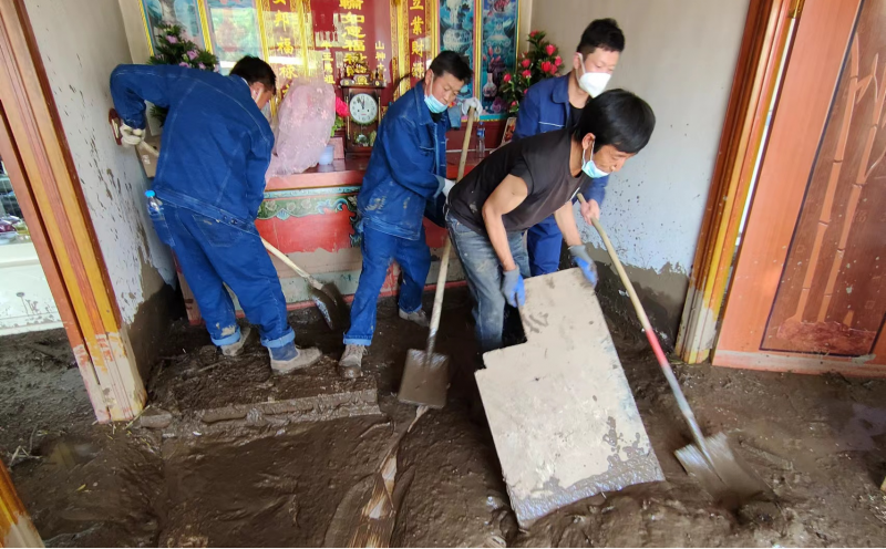 在救災現場,公司抗洪救災突擊隊和先鋒隊員,充分發揚“不怕苦、不怕累,敢奉獻、勇擔當”的精神,按照“8.18”山洪災害搶險救援處置工作應急指揮部的統一安排,迅速投入到清除淤泥和道路清障等工作。大家不間歇地用鐵鍬清、用架子車拉,兩天共清理十家住戶和三戶商鋪的屋內外淤泥,裝運泥漿20余噸。